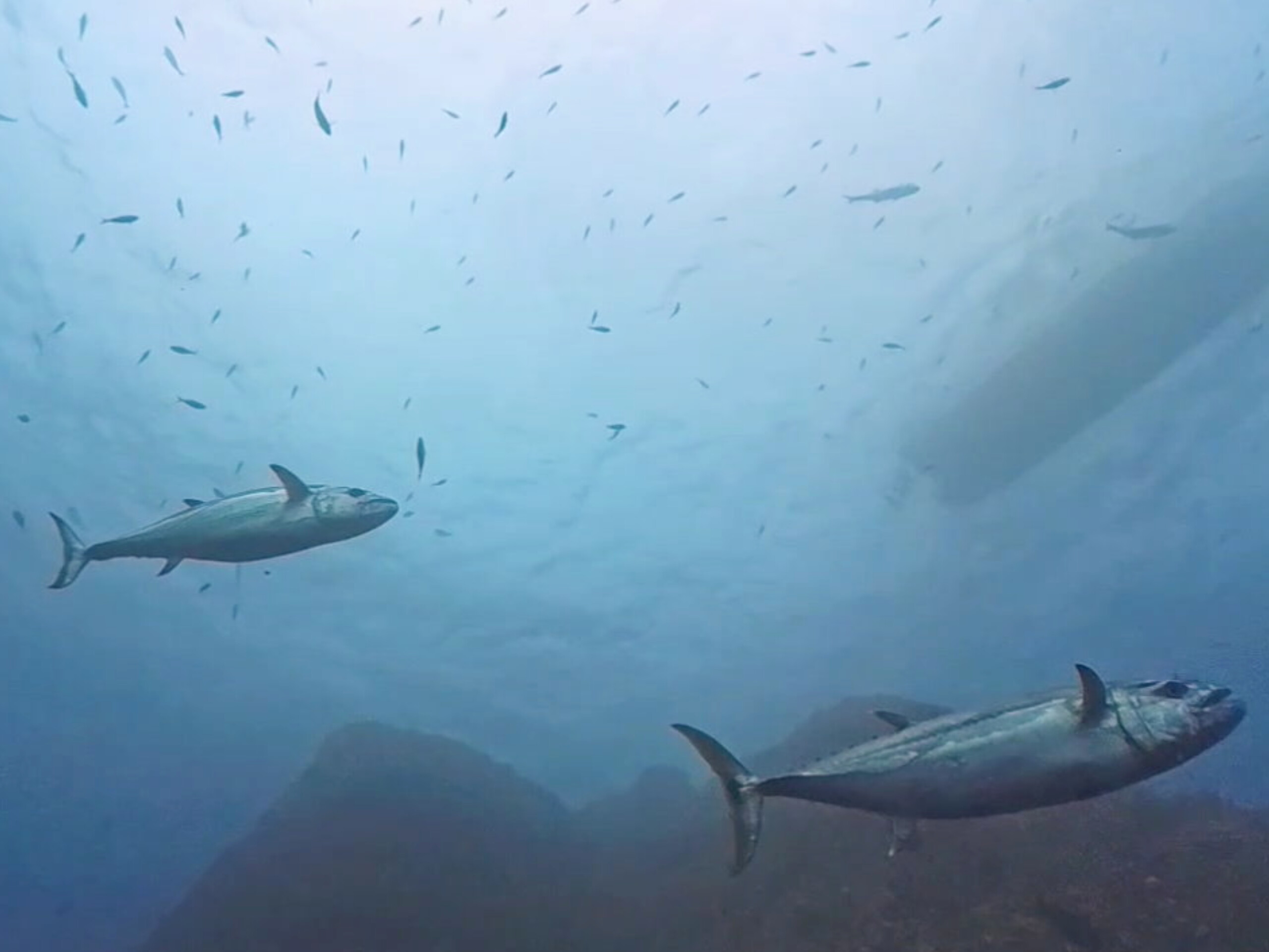 中層で群れを見てるとロウニンが慌しく一斉に泳ぎだして、水面ではホッパー号がガラガラと何やら騒いでる感じがした矢先の出来事。